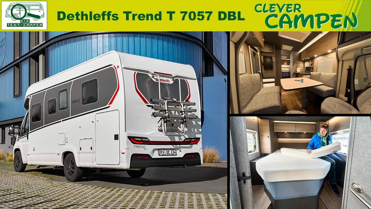 - Charakter: Die Trend-Baureihe von Dethleffs gehört inzwischen zur gehobenen Mittelklasse. Fünf Grundrisse mit 6,99–7,41 m Länge sind bestellbar. Drei Modelle haben die beliebten Einzelbetten im Heck, eins kommt mit Queensbett zum Händler, und der T6877 hat ein Querdoppelbett im Heck. Serienmäßig haben alle Modelle zwei feste Schlafplätze an Bord, ein Hubbett gibt es für alle Grundrisse optional. Braucht man nur selten vier Schlafplätze, kann man bei allen Mobilen optional, wie im Testwagen, ein Sitzgruppen-Umbaubett ordern.