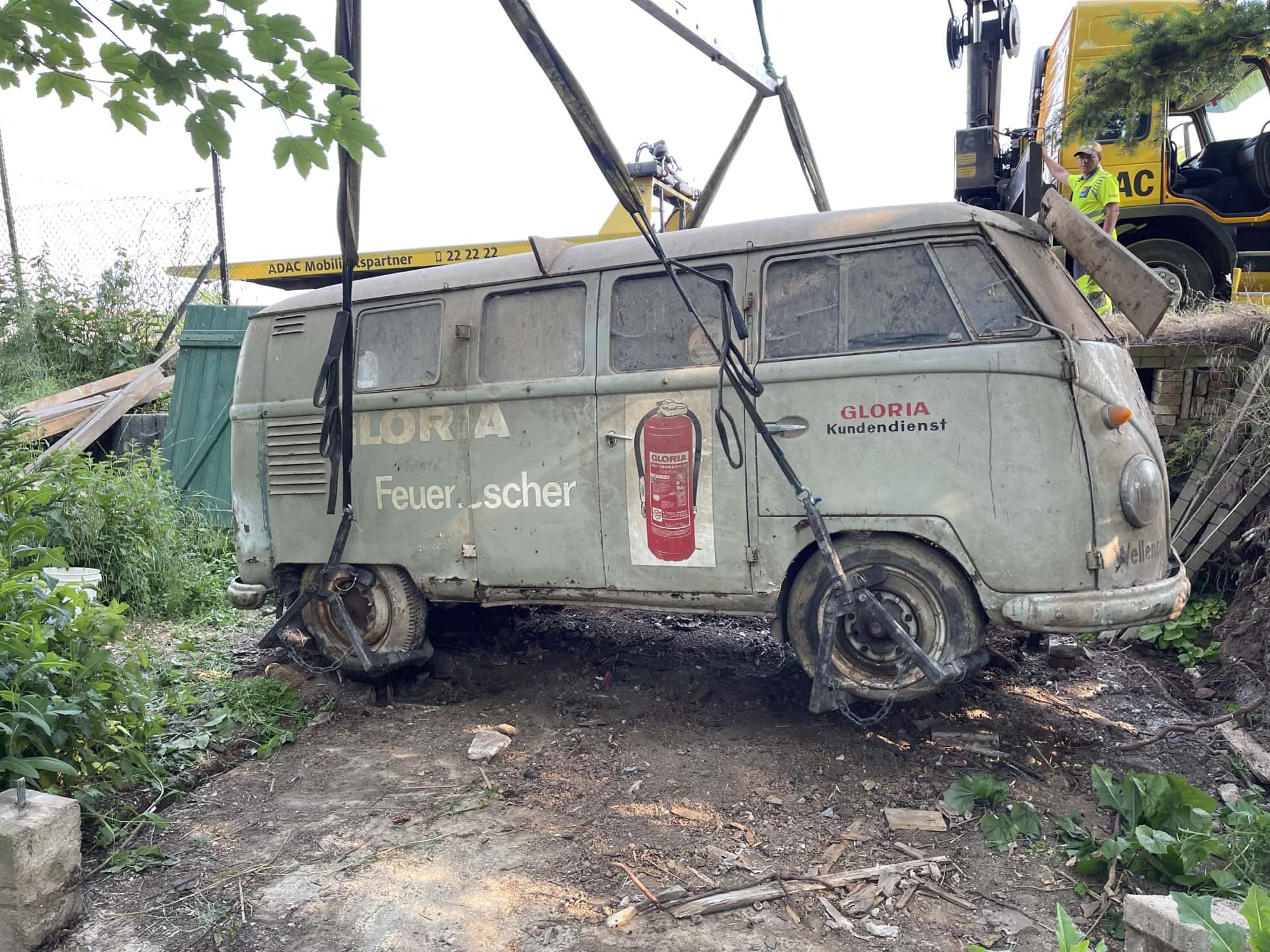 Zunächst mussten Bäume gefällt, Hecken geschnitten und die Laube abgerissen werden, bis der Bulli freilag und von einem Kran geborgen werden konnte.