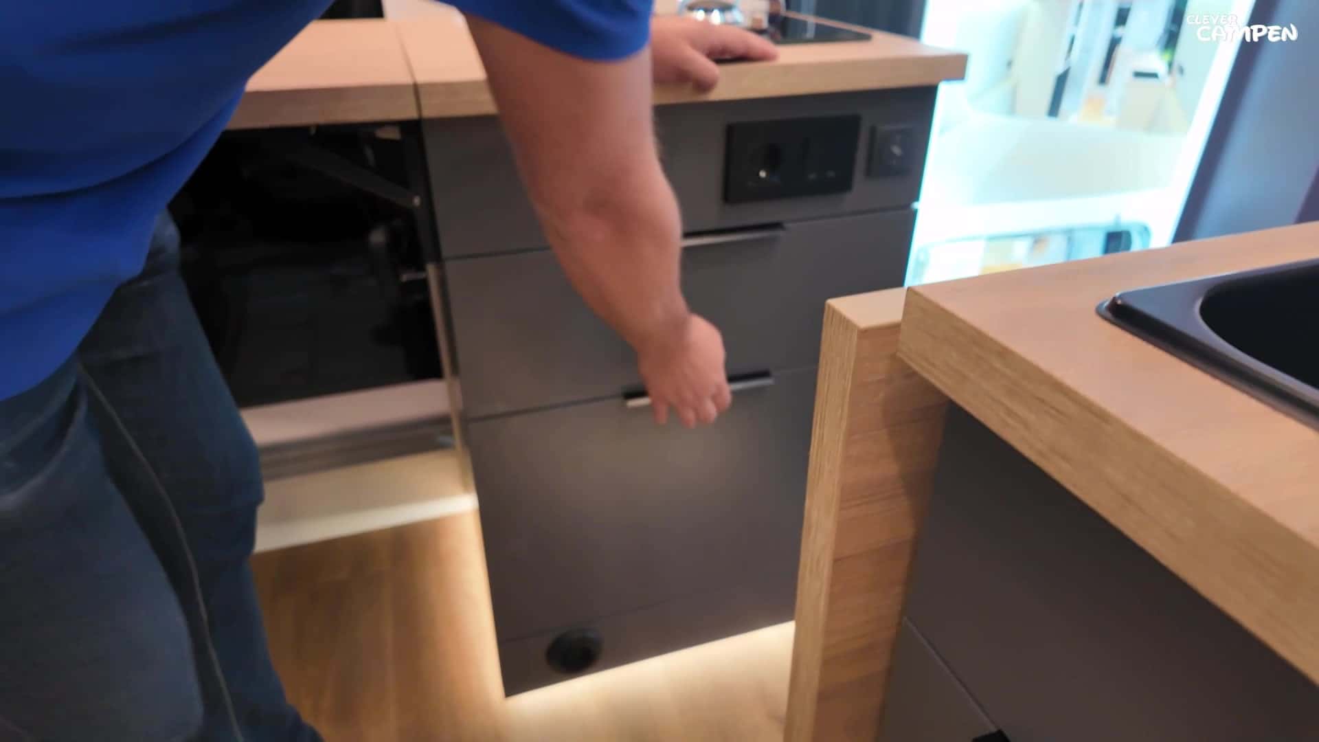 Gas wird übrigens nur für Kocher und Warmwasser genutzt, geheizt wird mit einer Dieselheizung. Die fest eingebaute Gasflasche lässt sich von außen befüllen, sodass im Innenraum kein Flaschenwechsel nötig ist.