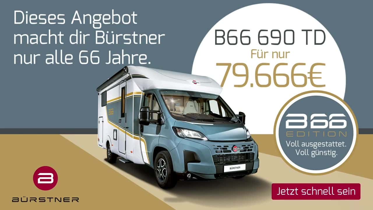 Bürstner wird 66 – und feiert diesen Meilenstein mit einer Edition, die Wohnmobilfans sofort anspricht. Die B66 Jubiläumsmodelle verbinden attraktive Preisvorteile mit hochwertiger Technik, moderner Ausstattung und einem eigenständigen Design. Ein Angebot, das nicht laut sein muss, um aufzufallen.