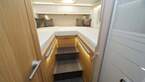 Vor dem Schlafzimmer im Heck entsteht ein neues Raumbad mit separater Dusche. In der Küche werden grifflose Schubladen und eine neue Arbeitsfläche eingebaut. Im Wohnbereich sorgt eine Multimediawand für Unterhaltung mit TV-Halterung, USB-Eingängen, Ladegerät fürs Handy und Lautsprechern.