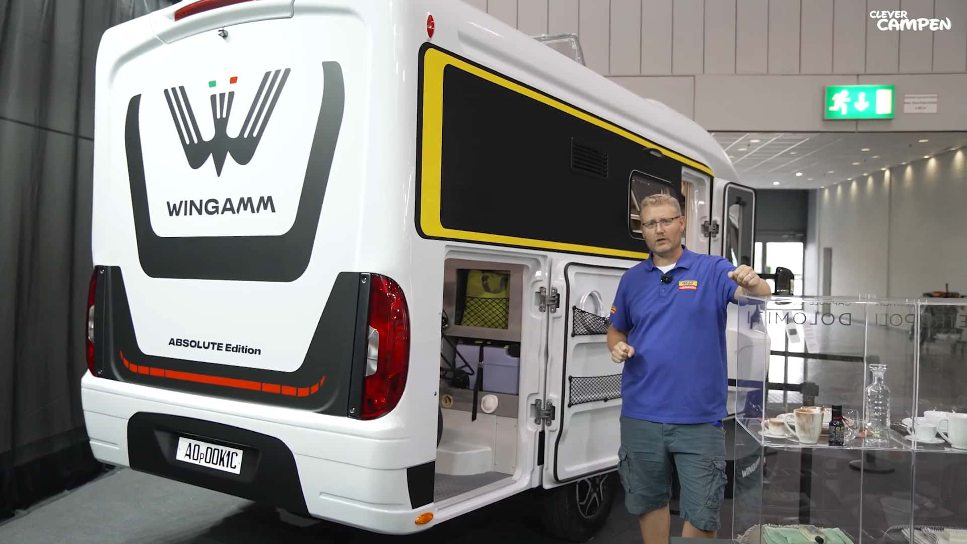 Als Basisfahrzeug kommt ein Fiat Ducato zum Einsatz, wie schon im Oasi 610, über den wir hier berichtet haben. Der neue kommt mit schnittiger gelber Akzent-Linie, die sich in das Bild des stromlinienförmigen Aufbaus einfügt. Auf dem Heck prangt großflächig das Wingamm-Logo.