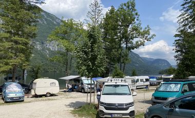 Am See Bohinjsko Jezero angekommen, werde ich von einer besänftigenden Stille empfangen. Als auch der Motor des Nugget verstummt, ist nichts weiter zu hören als Vogelgezwitscher und die gleichmäßigen Schläge eines Paddlers auf dem sonst spiegelglatten See. In dieser Idylle möchte ich meine erste Nacht im Triglav-Nationalpark verbringen. Ich fahre das Camp Zlatorog Bohinj nahe der Ortschaft Ukanc an. Der Campingplatz grenzt unmittelbar an den Bohinjsko Jezero. Obwohl er gut belegt ist, ist es erstaunlich ruhig. Es scheint, als ob die Gäste sowohl die unberührte Natur als auch die von diesem Ort ausgehende Stille schätzen und respektieren. Für mich der perfekte Platz, um mein Nachtlager aufzuschlagen.