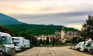 Stellplatz in Sabbionara. Der Stellplatz liegt auf einem Parkplatz. Befestigter Untergrund.
