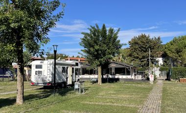 Gebührenfreier Stellplatz für 5 Mobile in Stezzano. Wasser, Entsorgung Grauwasser, Entsorgung Chemie-WC, Hunde im Übernachtungspreis enthalten.