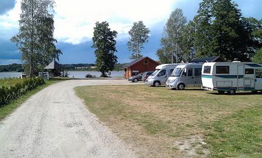 Stellplatz außerhalb von Bromölla. Der Stellplatz liegt an einer Marina und an einer Gaststätte. Überwiegend ebener Untergrund, kein Schatten.