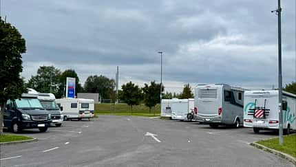 Gebührenpflichtiges Stellplatz am Ortsrand von Ljubljana. Der Stellplatz liegt auf einem Parkplatz und auf einem für Reisemobile angelegten und ausgewiesenen Areal. Überwiegend ebener Platz. Betonierter Untergrund. ÖPNV-Anschluss am Stellplatz. Am Platz: Kiosk, Fahrradverleih, Stellplatz beleuchtet. In der Nähe: Altstadt, Botanischer Garten, Theater/Oper, Schloss/Burg, Erlebnisbad, Hallenbad, Therme/Heilbad, Park, ausgewiesene Fahrradwege. Preis pro Nacht inklusive zwei erwachsener Personen: 10 EUR. Bezahlung: Parkscheinautomat. Strom, Wasser, Entsorgung Grauwasser, Entsorgung Chemie-WC im Übernachtungspreis enthalten. V+E für Durchreisende: kostenlos. Maximaler Aufenthalt: 6 Nächte.