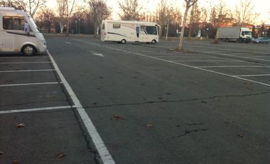 Riesen Parkplatz. Ohne Schatten. Haben weit hinten geparkt,da war es recht ruhig.Neben einem Schwimmbad,Eintritt ca. 6€ und schon ist man geduscht. Wasserhahn und Mülltonnen vorhanden.