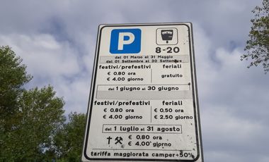 Gebührenpflichtiges Stellplatz in Lido degli Scacchi. Der Stellplatz liegt auf einem Parkplatz.