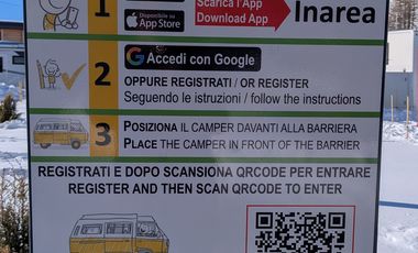 Gebührenfreier Stellplatz in Sauze d'Oulx. Der Stellplatz liegt in den Bergen und auf einem Parkplatz. Teilweise unebener Untergrund, kein Schatten. Befestigter Untergrund. Am Platz: Stellplatz beleuchtet.