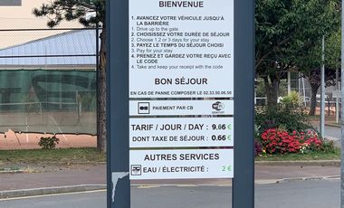 Gebührenpflichtiges Stellplatz für 20 Mobile am Ortsrand von Granville. Der Stellplatz liegt auf einem Parkplatz. Überwiegend ebener Untergrund, kein Schatten. Befestigter und geschotterter Untergrund. Zentrum zu Fuß erreichbar. Am Platz: Frischwasser, Strom, Entsorgung Grauwasser, Entsorgung Chemie-WC, Hunde erlaubt. In der Nähe: Museen. Preis pro Nacht: 11 EUR. Bezahlung: Parkscheinautomat. Strom: 3 EUR/55 Min., Wasser: 3 EUR/10 Min. Maximaler Aufenthalt: 1 Nacht. Die Zufahrt erfolgt über eine Einbahnstraße.