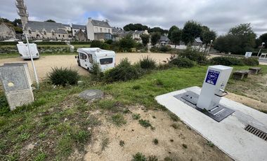 Gebührenfreier Stellplatz für 10 Mobile am Ortsrand von La Martyre. Überwiegend ebener Untergrund, kein Schatten. Befestigter Untergrund. Am Platz: Frischwasser, Entsorgung Grauwasser, Entsorgung Chemie-WC, Hunde erlaubt.