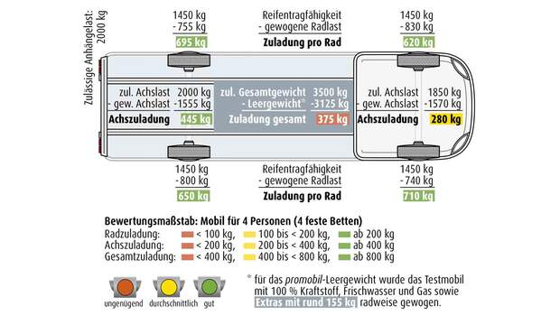 So brachte der Testwagen inklusive gefüllter Kraftstoff- und Wassertanks sowie zweier Gasflaschen 3.125 Kilogramm auf die Waage – Restzuladung 375 Kilo. Beschränkt man sich auf die nötigsten Extras und nutzt den Frischwassertank nur in Fahrstellung (10 L), kann es für zwei Erwachsene und zwei Kinder reichen. Die versprochene "Leichtigkeit des Seins" stellt sich aber nicht ein.