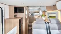 Mit dem Etrusco T 6900 SB folgt ein weiteres Mal der günstigeren Hersteller. Der 6900 SB verfügt über eine Zuladung von 660 Kilogramm. Die größten Gepäckstücke kommen in der Heckgarage unter dem Querbett unter. Nach einem schmalen Kleiderschrank folgt das Raumbad mit separater Dusche. Unter dem Hubbett im Bug gibt es eine große Sitzguppe bestehend aus einer quer und einer längs angesiedelten Sitzbank.