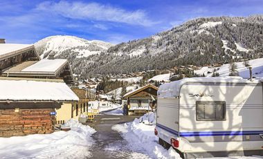 Für Wohnmobile unter 10 Meter Länge gibt es Stellplätze auf dem "Parking P2" unmittelbar an der Piste. 26 Euro pro Nacht und Mobil plus Kurtaxe, 182 Euro pro Woche. Es ist kein Strom vorhanden. Die Reservierung ist unbedingt empfohlen, auch online möglich.