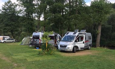 - In der Nähe: Eine Hecke trennt das Camp von der wenig befahrenen Straße. Teils schattig, Untergrund Wiese, schöner alter Baumbestand. Ortszentrum (Lokale, Supermarkt) zu Fuß erreichbar.