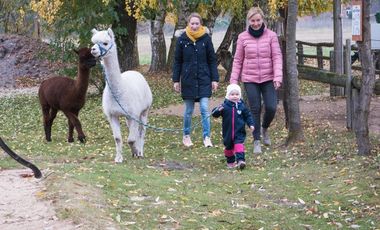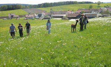 Seit 2011 hält Familie Regler auf ihrem Erlebnis-, Therapie- und Freizeithof Alpakas. Gäste und Besucher können verschiedene Touren mit den Tieren buchen. Mit einem Alpaka an der Leine geht es dann über die Streuobstwiese oder ins Doggersandsteingebiet. Bei der großen Drei-Stunden-Tour ist sogar ein Picknick mit Dinkelsnacks inklusive. Noch mehr Action bietet ein Alpaka-Erlebnis-Parkour, eine Art Hindernisparcours. Hier darf man die lustigen Herdentiere um Holzpylonen führen, über Sand- und Kieshügel, rückwärts oder durch einen Tunnel. So lernen Kinder wie Erwachsene das verspielte und gelassene Wesen der Tiere kennen.