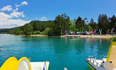 Hier gibt es nicht nur Wasserrutschboote: Das Strandcamping Gruber hat auch einen SUP-Verleih und bietet unter anderem auch Kajak-Kurse und Kanufahrten auf der Drau an.