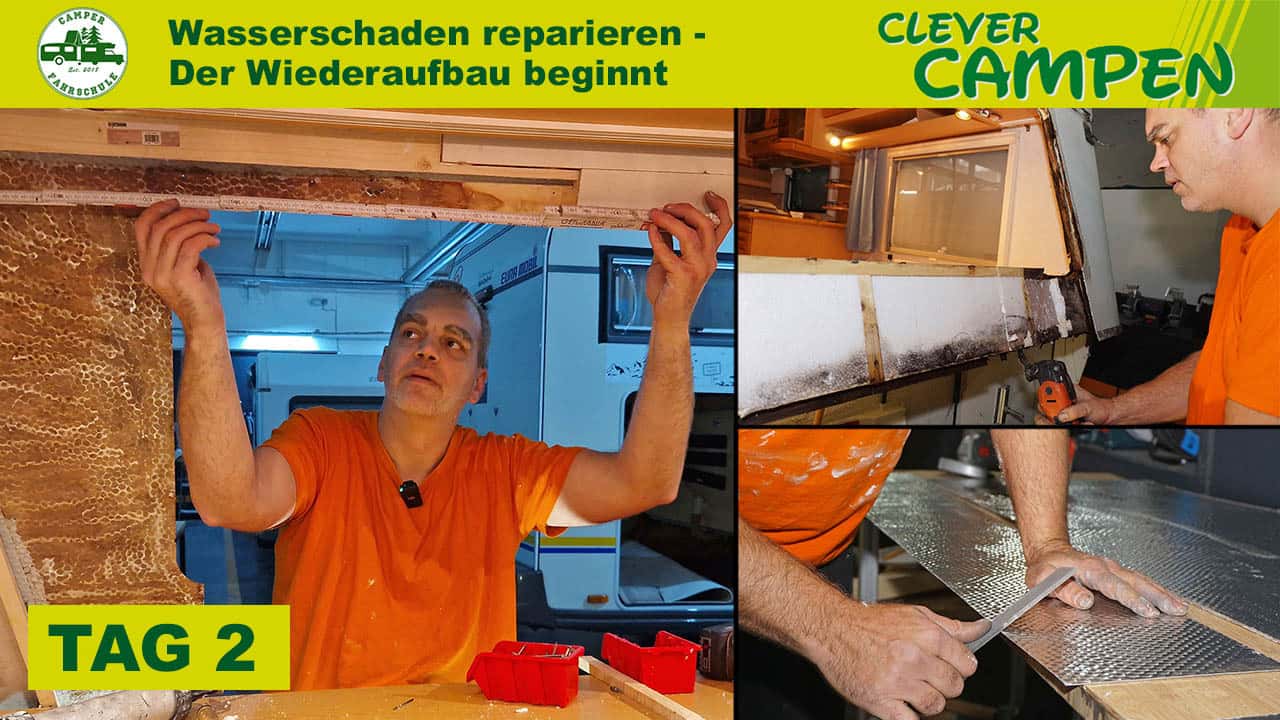 Beim Abschlussfoto ist die Menge an genutztem Werkzeug und Verbrauchsmaterial beeindruckend. Wer sich die Reparatur im Bewegtbild anschauen will, wird nach und nach auf unserem Youtube-Kanal Clever Campen fündig. Aktuell schneiden wir viele, viele Stunden an Videomaterial.