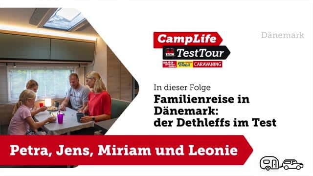 Für die Zeit in Dänemark nutzten sie als Zugfahrzeug einen eleganten, mit 3,3 Liter Hubraum und 550 Nm Drehmoment potent motorisierten Mazda CX-80 mit 2,5 Tonnen Anhängelast. Mehr als genug für den Dethleffs Camper 530 FSK. Das Modell mit Stockbetten und französischem Längsbett ist in der breit gefächerten Camper-Baureihe einer der typischen Familien-Grundrisse.