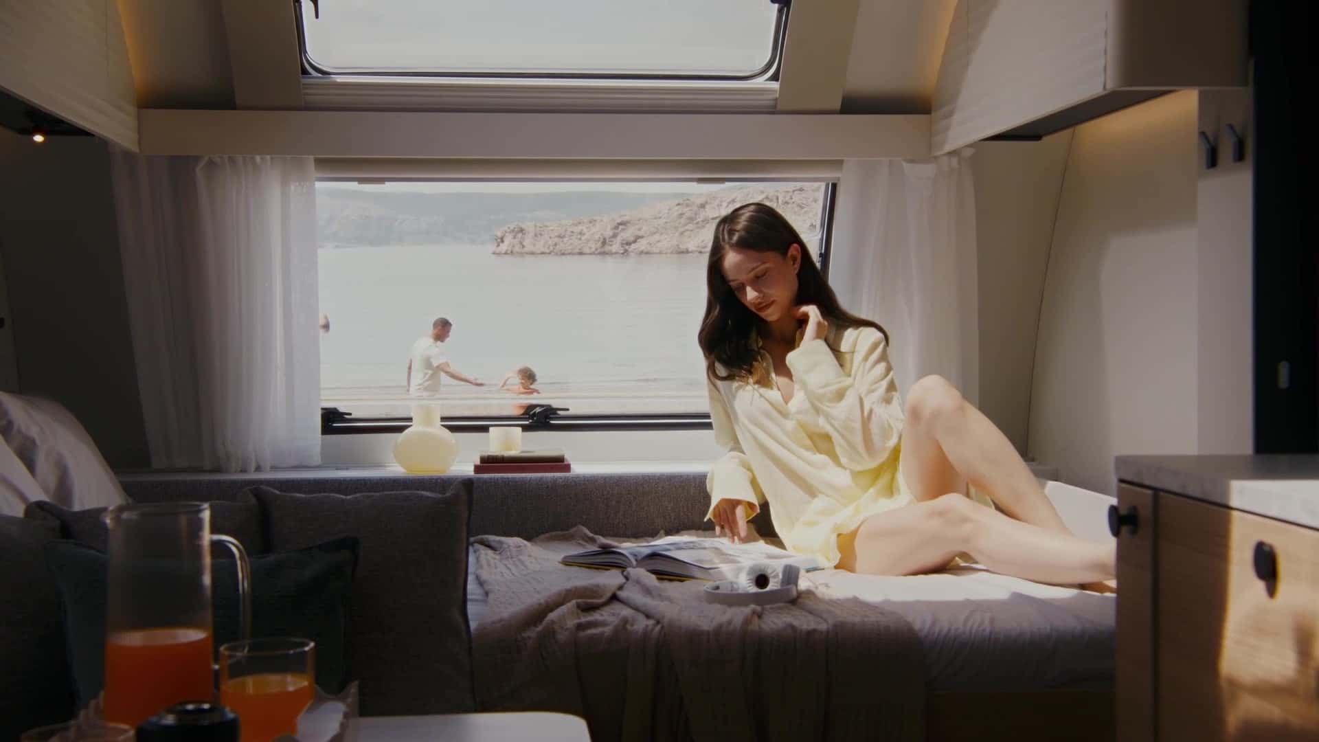 Im Inneren setzt der ADORA auf warme Naturtöne mit markanten schwarzen Akzenten. Großzügige, fließende Wohnbereiche und das große, integrierte Panoramafenster prägen das Raumgefühl: tagsüber lichtdurchflutet, abends dank durchdachtem Lichtkonzept angenehm wohnlich. Materialien, Polster und Bodenbelag wurden neu aufeinander abgestimmt, um die hochwertige Anmutung zu unterstreichen.