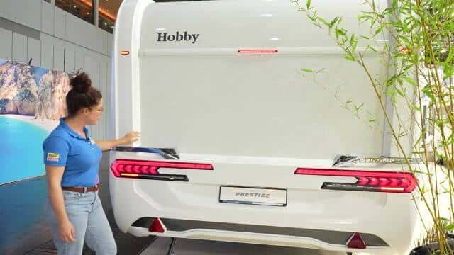 Alle Caravans im Programm von Hobby bekommen eine neue Heck-Maske. Der Heckleuchtenträger verfügt über zwei Rücklichter, die automotiv wirken sollen. Die Reflektoren am Hinterteil der Wohnanhänger sind in den Diffusor eingelassen. Die Rangiergriffe vorne wie hinten sind ins gewollt stromlinienförmige Design integriert, was für mehr Harmonie sorgen soll.